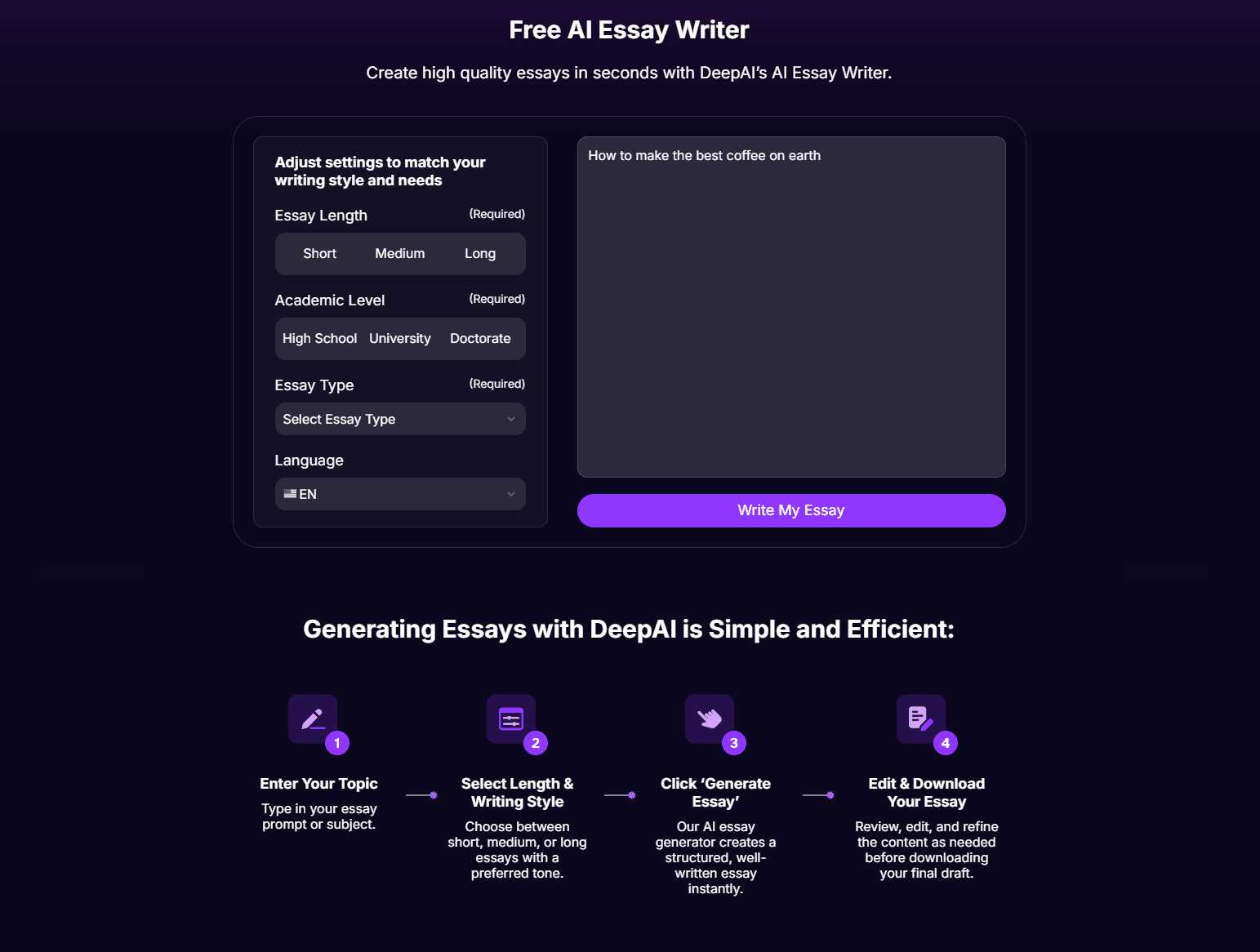 DeepAI offers a perfect essay writer AI experience, combining accuracy, speed, and customization to deliver top-quality content.